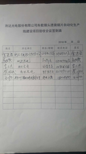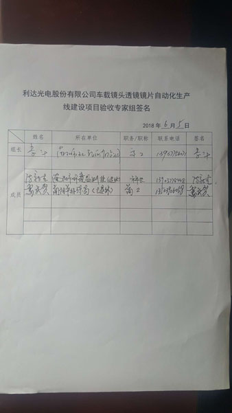 ???? 2018 年 6 月 5 日,利達(dá)光電股份有限公司根據(jù)利達(dá)光電股份有限公司車載鏡頭透鏡鏡片自動化生產(chǎn)線建設(shè)項(xiàng)目竣工環(huán)境保護(hù)驗(yàn)收監(jiān)測報告,并按照《建設(shè)項(xiàng)目竣工環(huán)境保護(hù)驗(yàn)收暫行辦法》,嚴(yán)格按照國家有關(guān)法律法規(guī)、建設(shè)項(xiàng)目竣工環(huán)境保護(hù)驗(yàn)收技術(shù)規(guī)范/指南、本項(xiàng)目環(huán)境影響評價報告表和審批部門審批意見等要求,主持召開了該公司車載鏡頭透鏡鏡片自動化生產(chǎn)線建設(shè)項(xiàng)目環(huán)境保護(hù)竣工驗(yàn)收會議。參加驗(yàn)收會議的有項(xiàng)目建設(shè)單位(利達(dá)光電股份有限公司)、環(huán)評單位(南陽市環(huán)境保護(hù)科學(xué)研究所有限公司)、驗(yàn)收監(jiān)測報告編制單位(鄭州譜尼測試技術(shù)有限公司)的領(lǐng)導(dǎo)、代表及邀請的專家共計(jì) 6 人,會議成立了項(xiàng)目竣工環(huán)境保護(hù)驗(yàn)收組(名單附后),負(fù)責(zé)項(xiàng)目的驗(yàn)收工作。