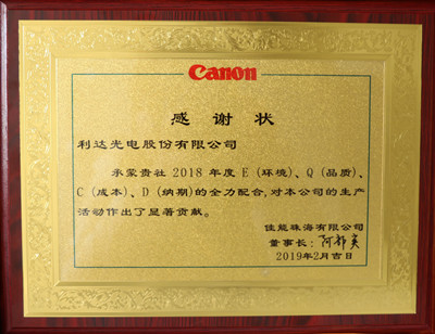 利達光電榮獲佳能珠海有限公司2018年度優(yōu)秀供應(yīng)商