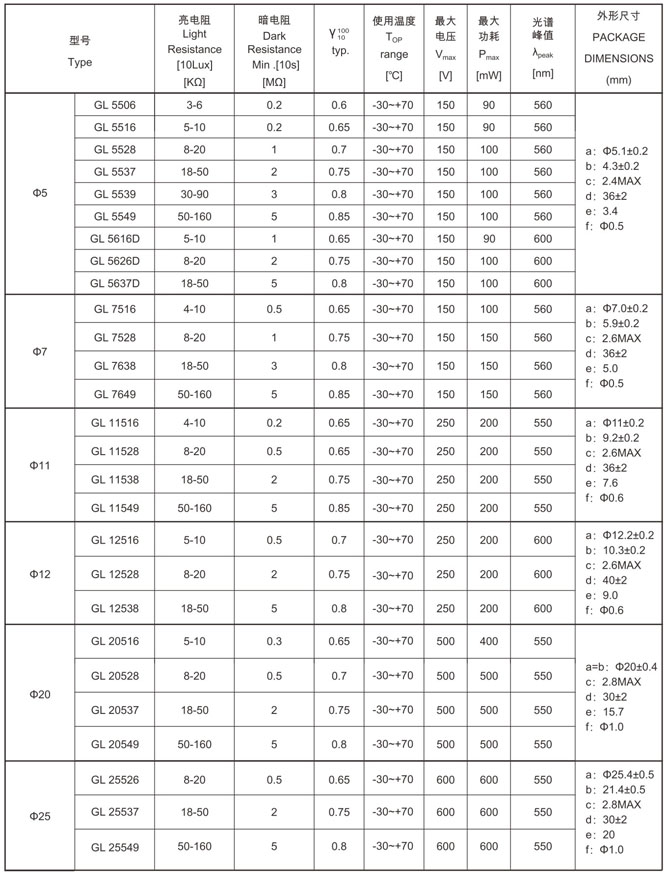 環(huán)氧樹脂封裝型光敏電阻系列1 Resin Package Photocells Series1