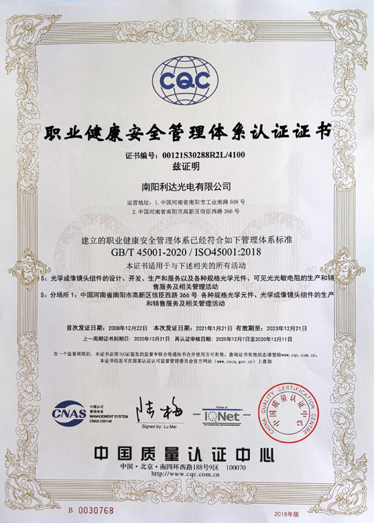 職業(yè)健康安全管理體系認證證書(中文)